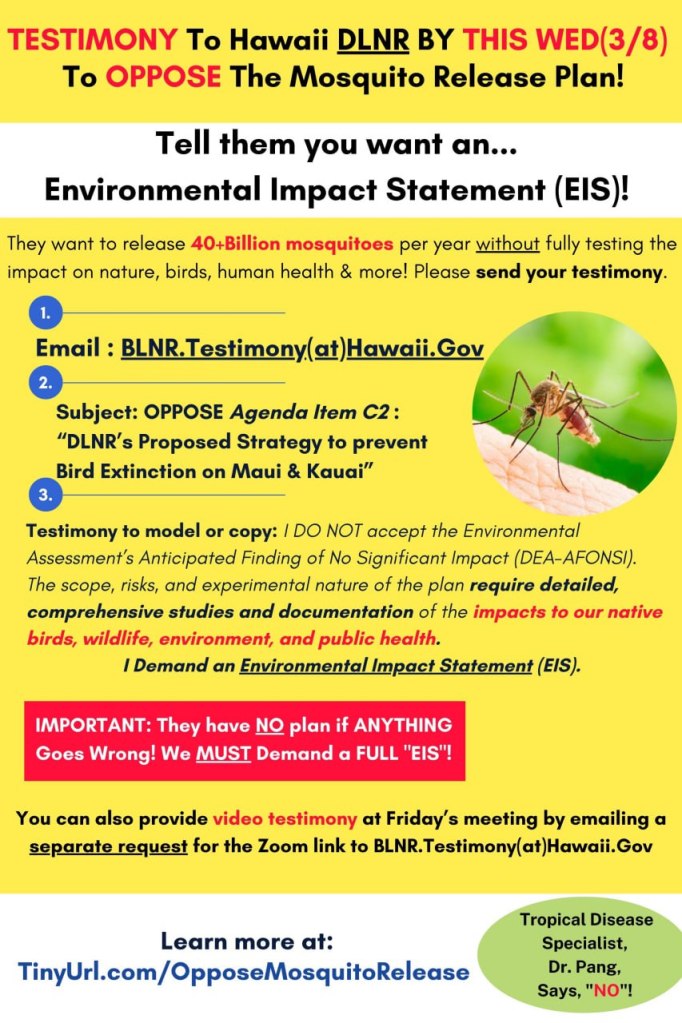 I’m opposed to the planned biopesticide mosquito releases on Maui. This project is an experiment on our island home. There are serious risks, and the outcome is admittedly unknown.