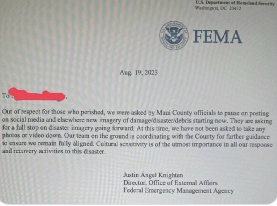 Don’t forget as stated earlier that the officials were off island such as the fire chief. Supposedly all the officials that were needed to identify and extinguish a real fire were called to Oahu for a FEMA meeting. So, it seems that a common denominator is the infamous FEMA. I reached out to a contact I know personally in FEMA and Red Cross in regards to the situation in Maui and I have still received no response on the matter. I can vouch that he is a good intentioned man, concerned with the safety of others when it comes to his service. Sometimes no answer is a loud answer and even good people are wrapped up in situations where their superiors may have everyone at a loss for words. Hopefully, all the good intentioned people who were involved with the official fire relief and response in Maui can now see the ill intentions of those in control.